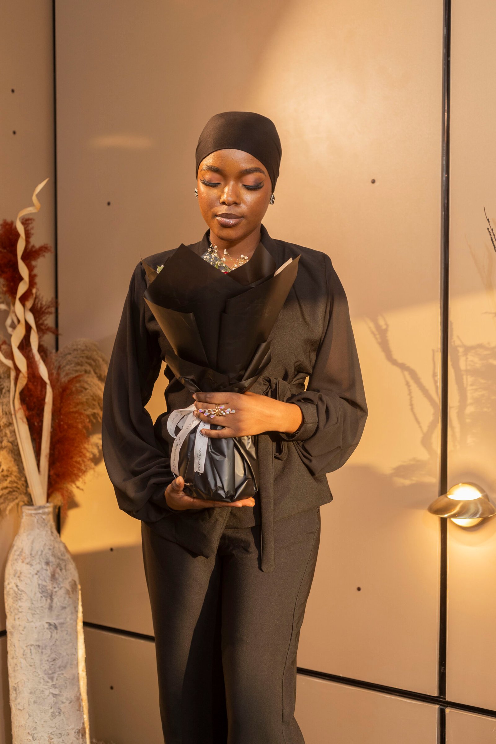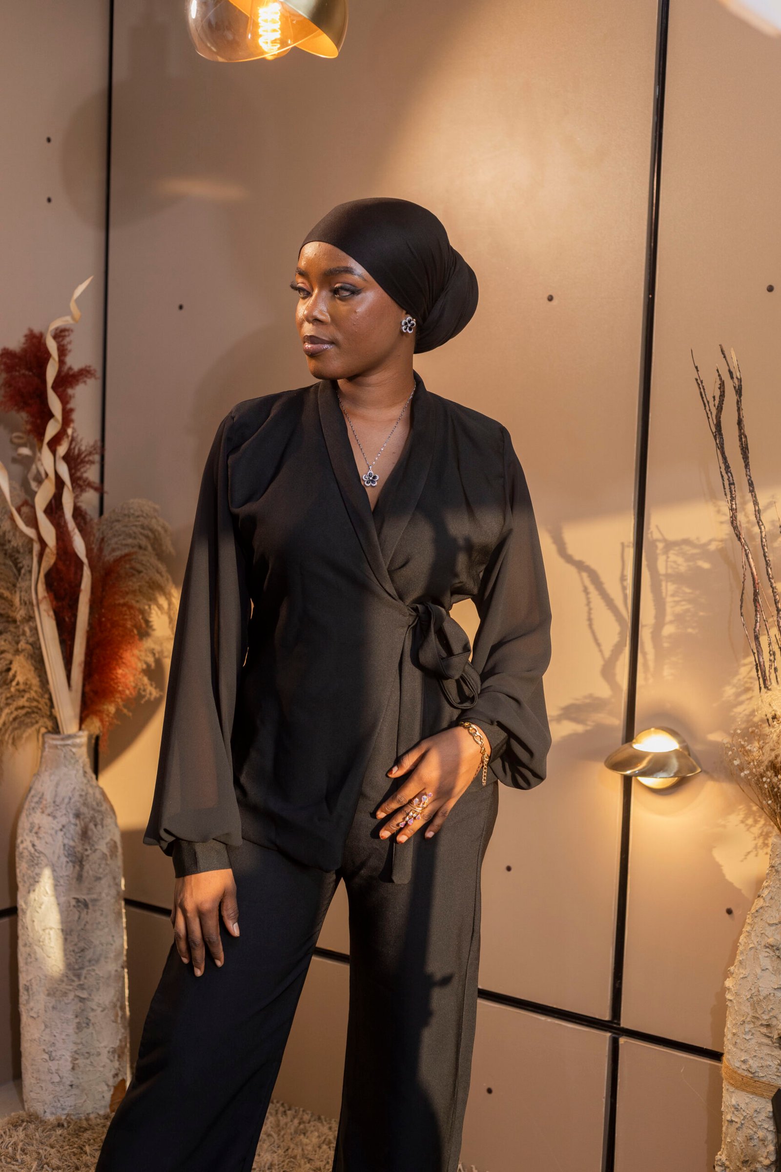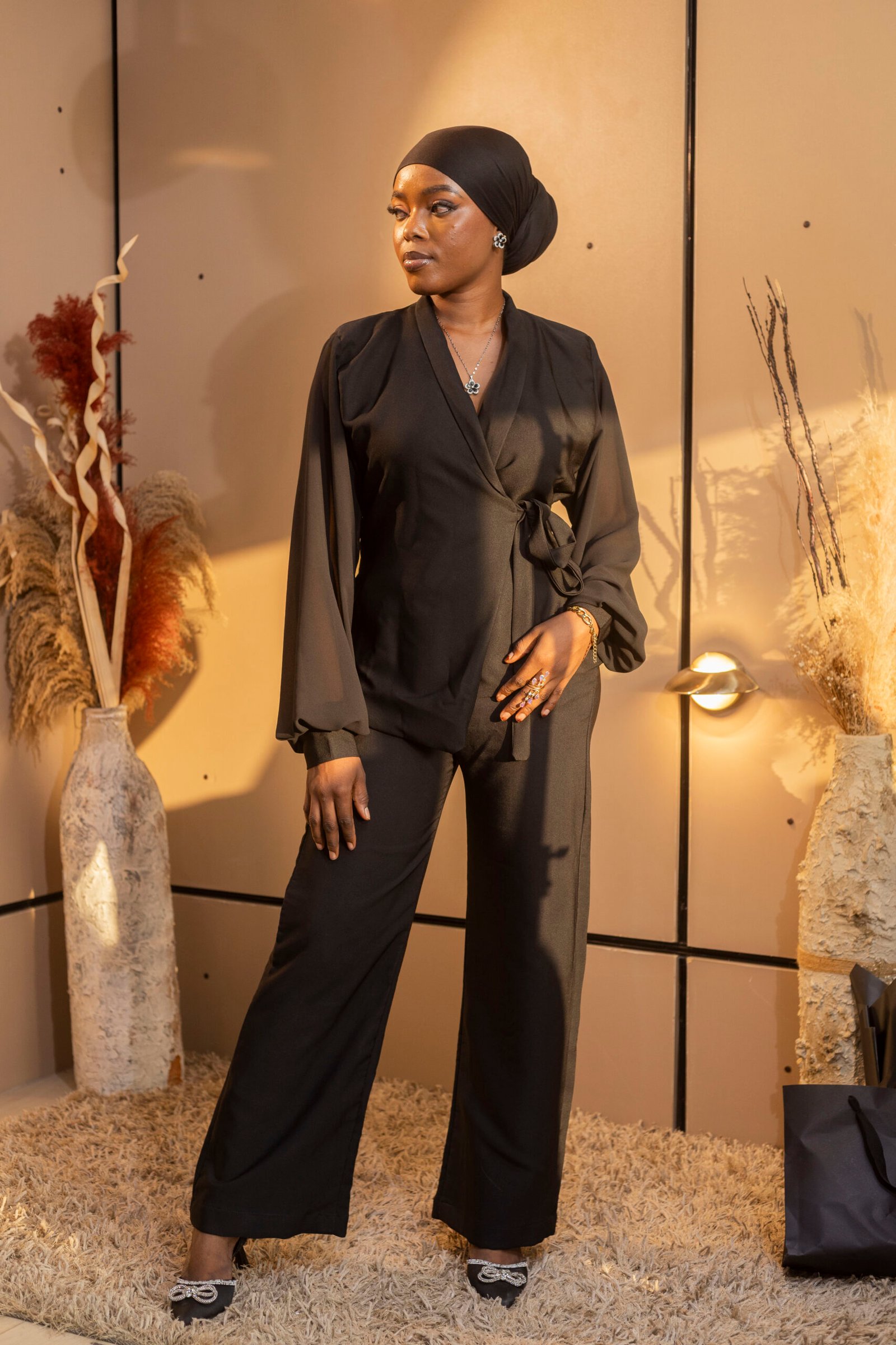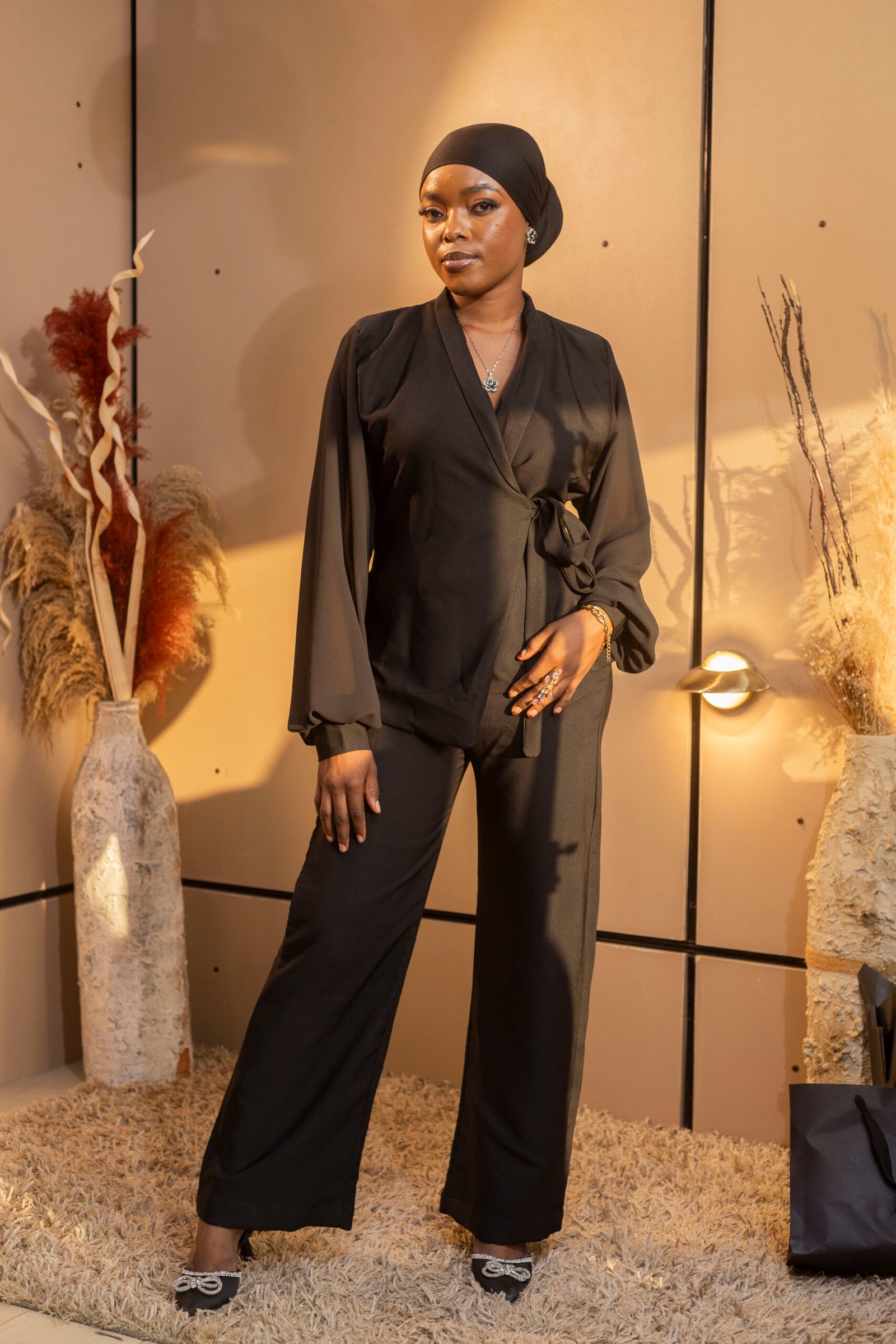 The palazzo pant is crafted to perfection with its relaxed yet tailored silhouette, allowing you to move with ease while maintaining a crisp and elegant profile. The wrap blazer top complements the pant impeccably, cinching at the waist to flatter your figure and create a clean, professional aesthetic. The chiffon sleeves add a touch of femininity and sophistication, transforming this outfit into a head-turning statement of style.
