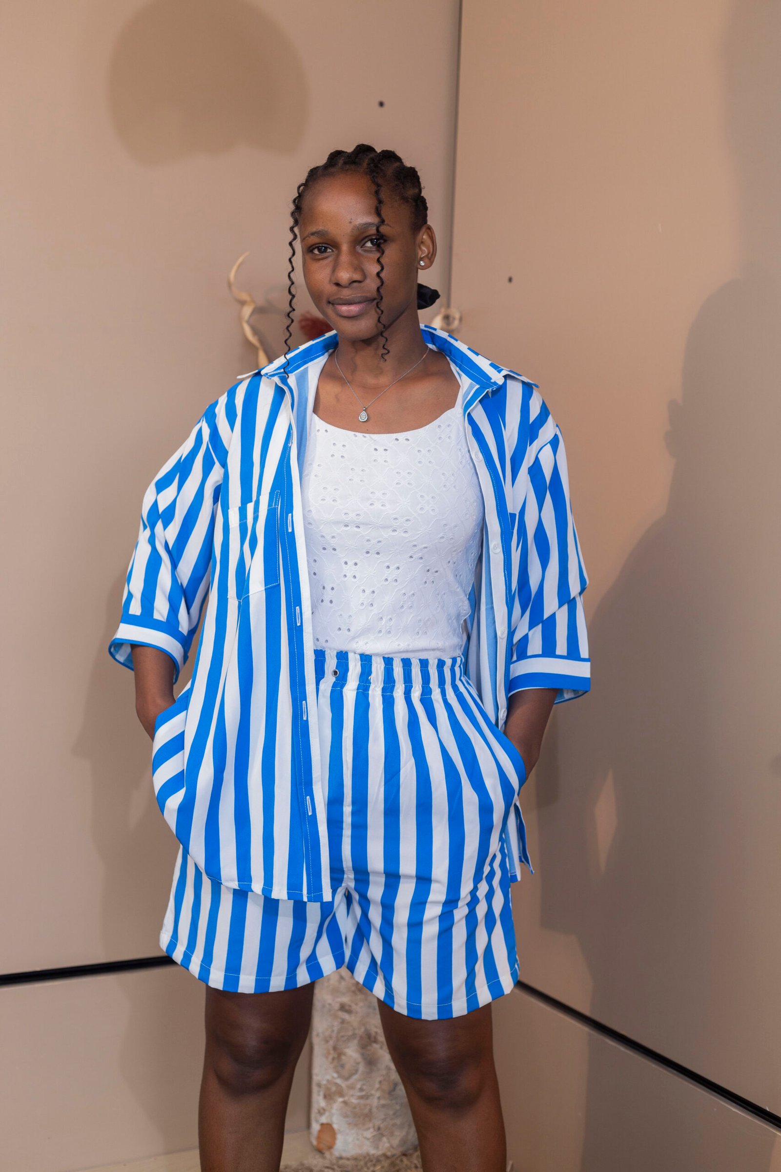 Looking for a perfect combination of style and comfort? Our two-piece shorts and shirt set in blue and white striped fabric is here to transform your everyday wardrobe. Designed with versatility and modern aesthetics in mind, this ensemble is tailor-made for casual outings, relaxing weekends, or even a stylish day at the beach. The crisp blue and white palette strikes the right balance between standout appeal and effortless sophistication.