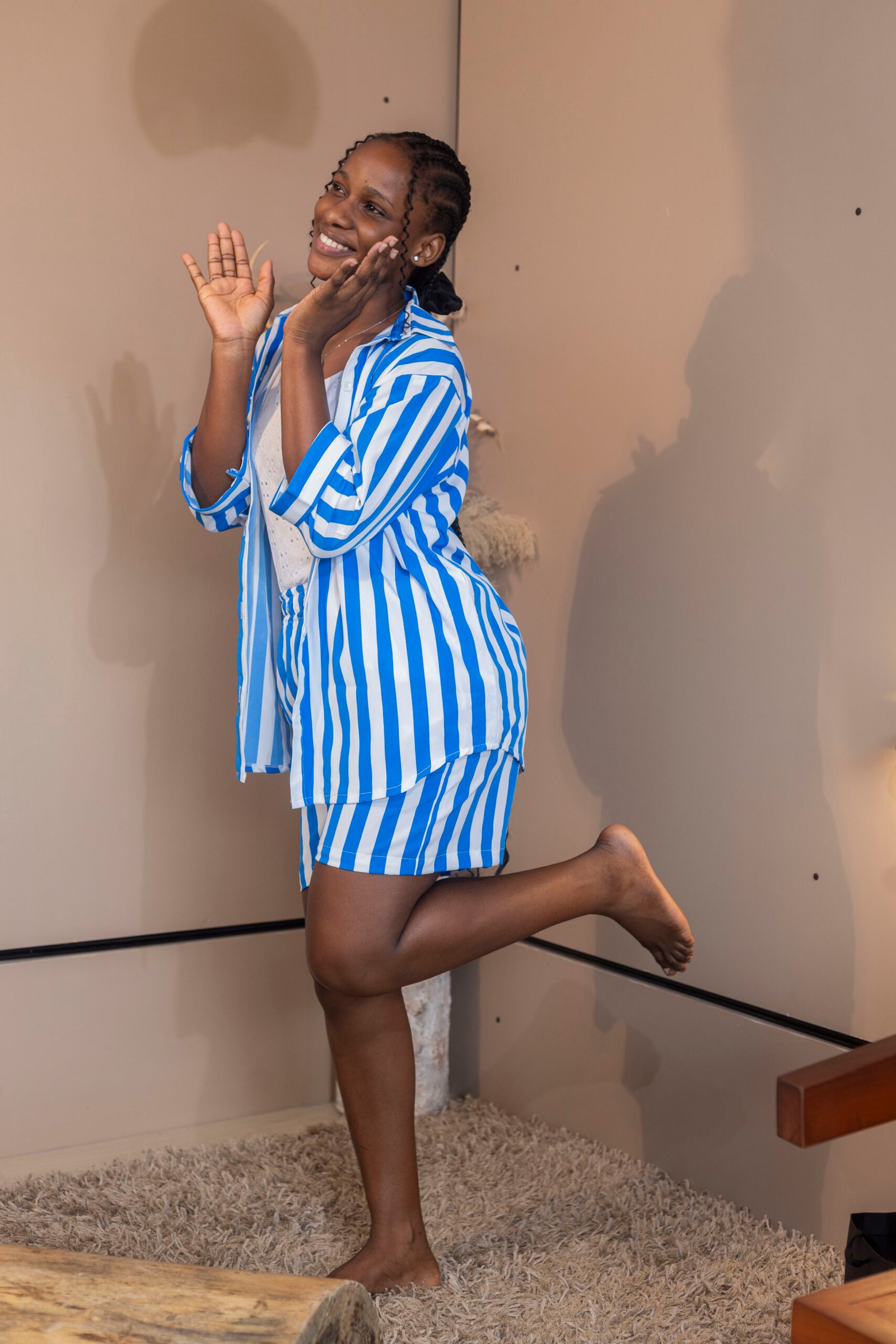 This two-piece set combines a sleek shirt and perfectly tailored shorts that are as practical as they are fashionable. The shirt features a breathable fit and elegant striped patterns that create a polished yet relaxed look. The shorts complement the shirt flawlessly, offering comfort and functionality with a design that doesn’t compromise on style. Together, they form a classic outfit you can rely on for various occasions, whether you’re lounging at home or stepping out to explore your city.